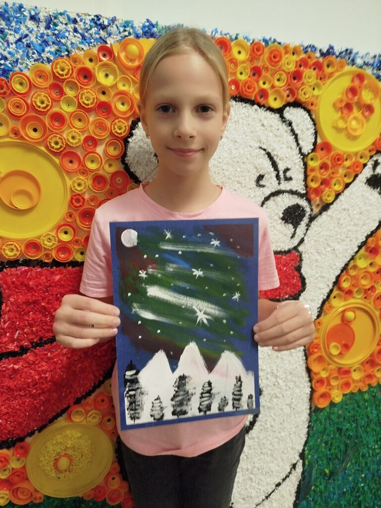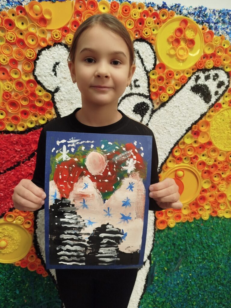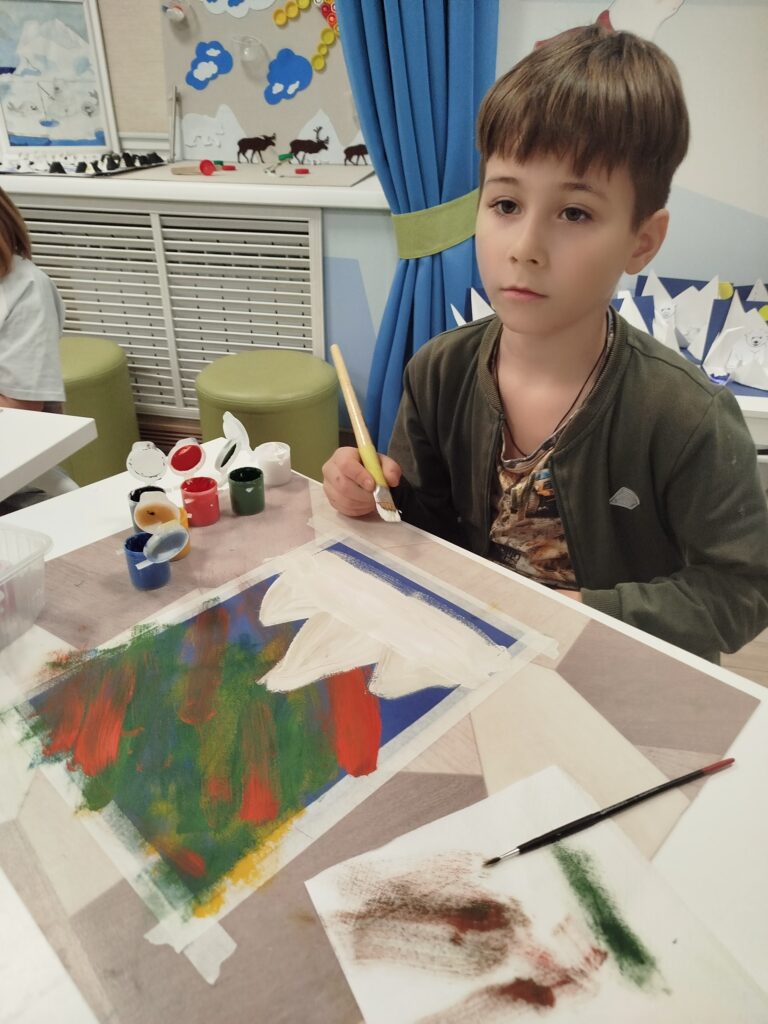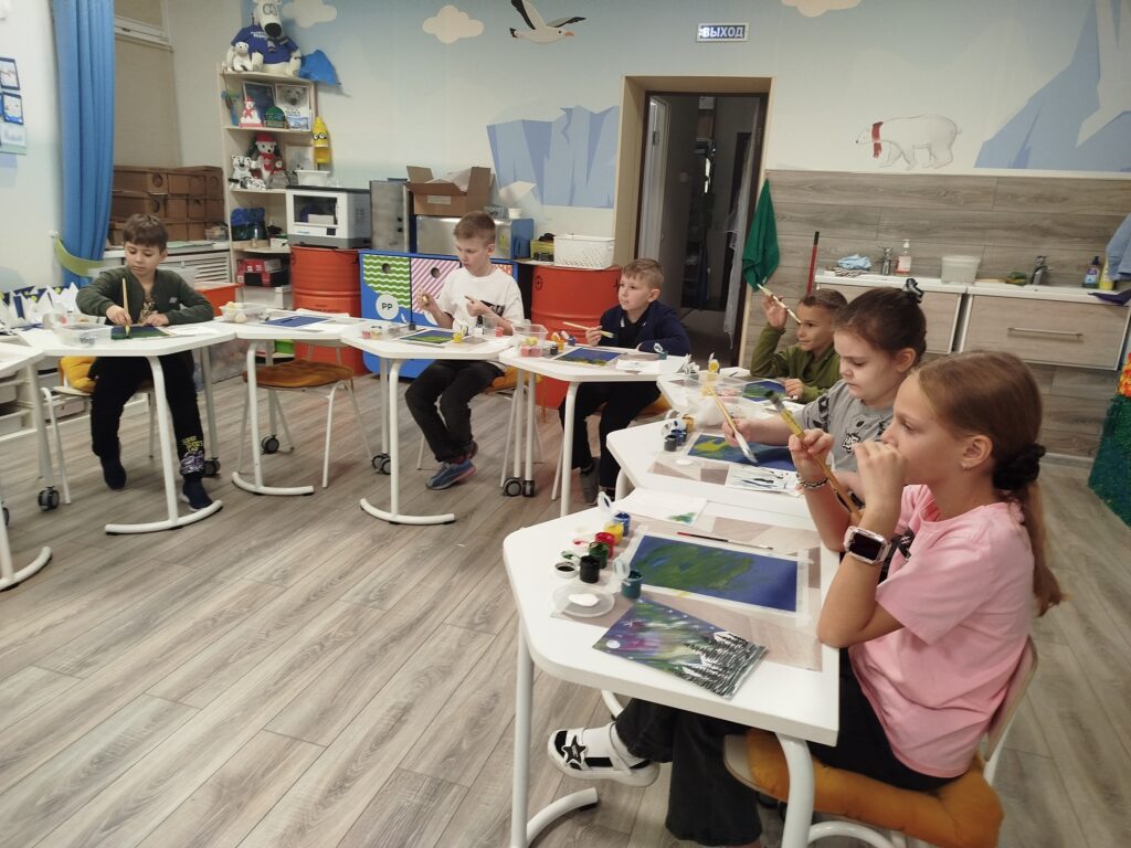 На наших творческих занятиях мы решили обратиться к самому опытному и профессиональному художнику — к природе, и нарисовать северное сияние в тундре. И у ребят вышло ничуть не хуже!