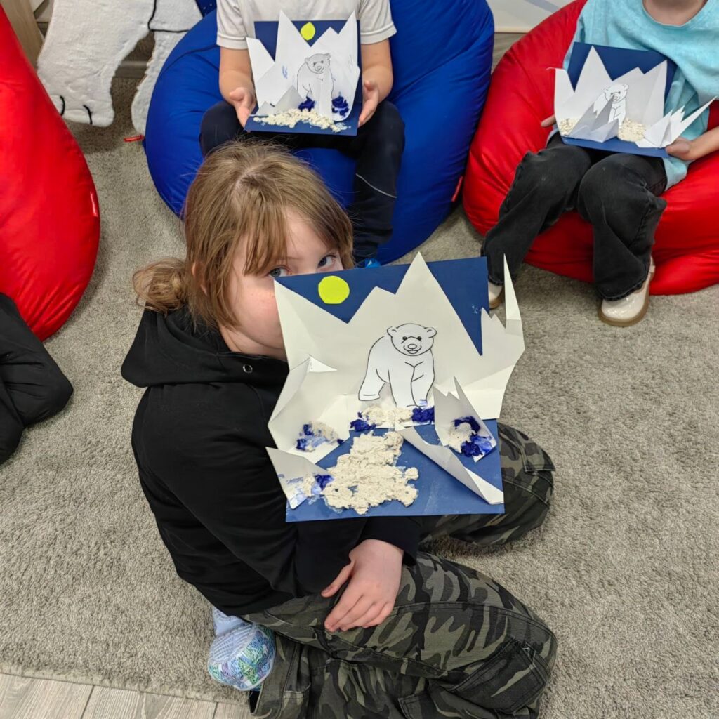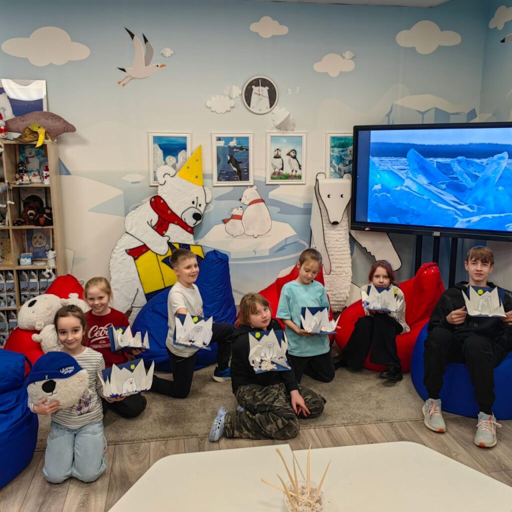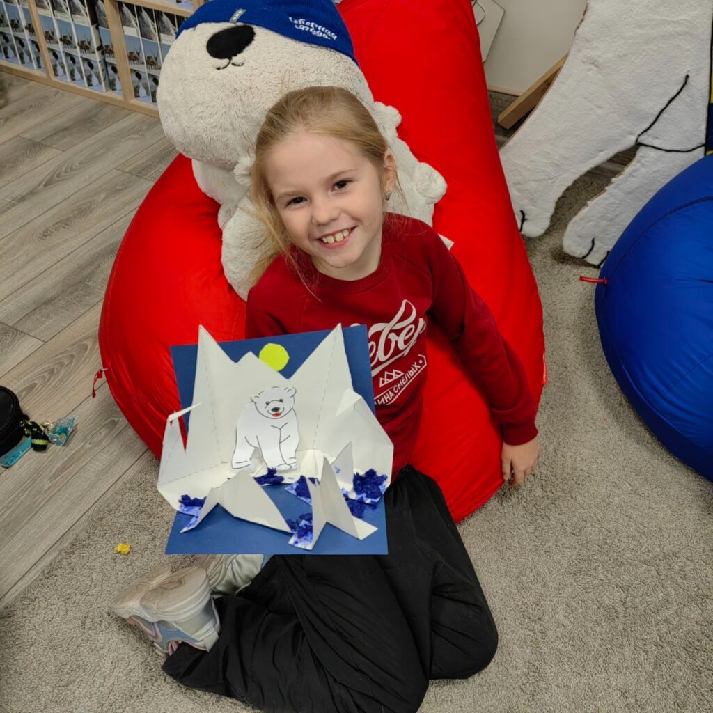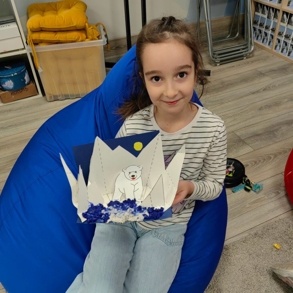 На первом занятии мы погружались в среду: ребята визуализировали ландшафты мест обитания белого медведя: бескрайние ледяные просторы, сверкающий снег и бесконечный полярный день. Мы не только обсудили условия жизни белых медведей, но и приобщились к бережному отношению к окружающей среде 🩵