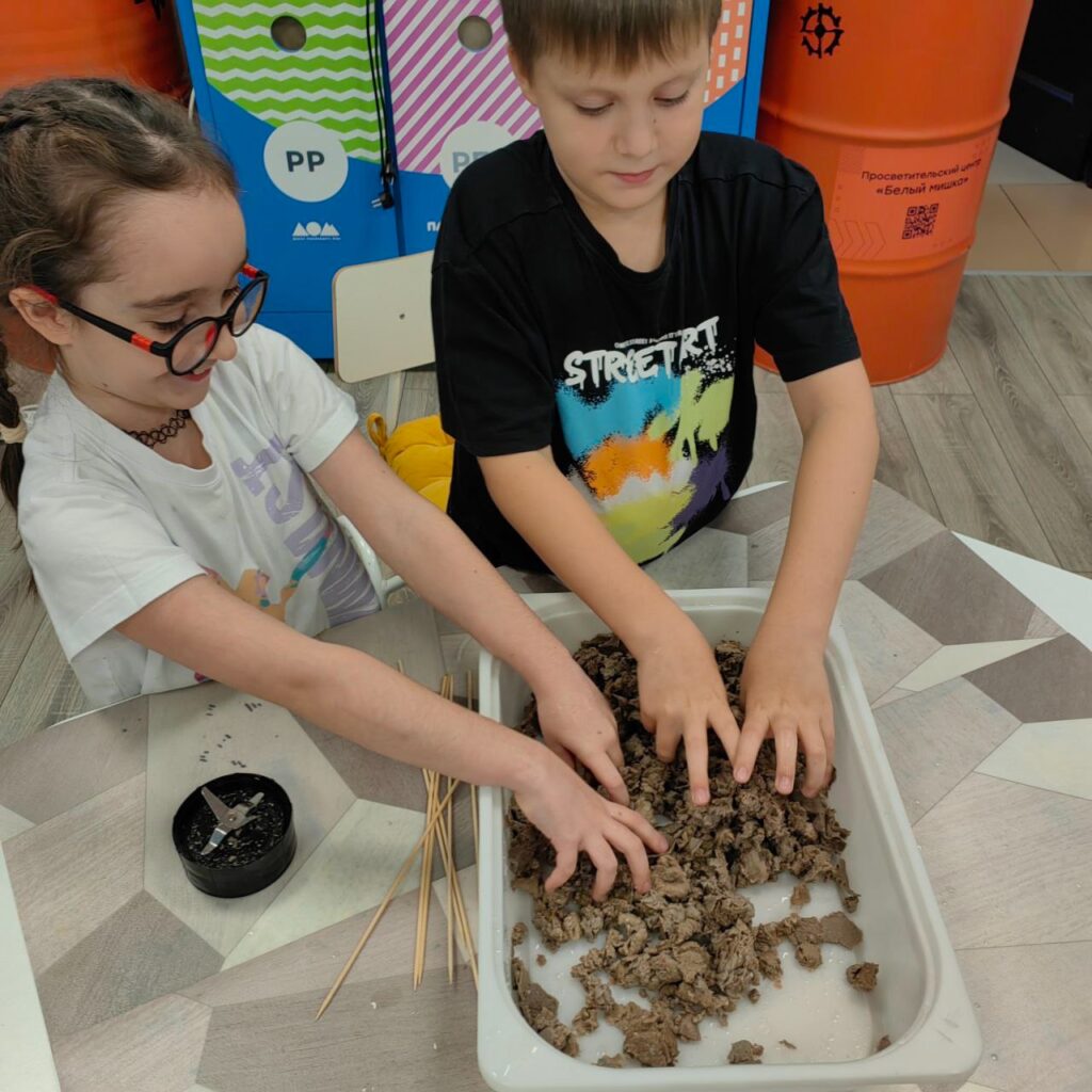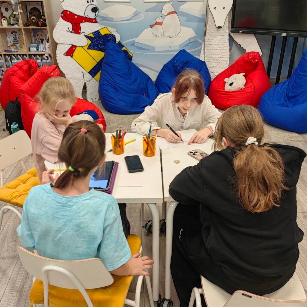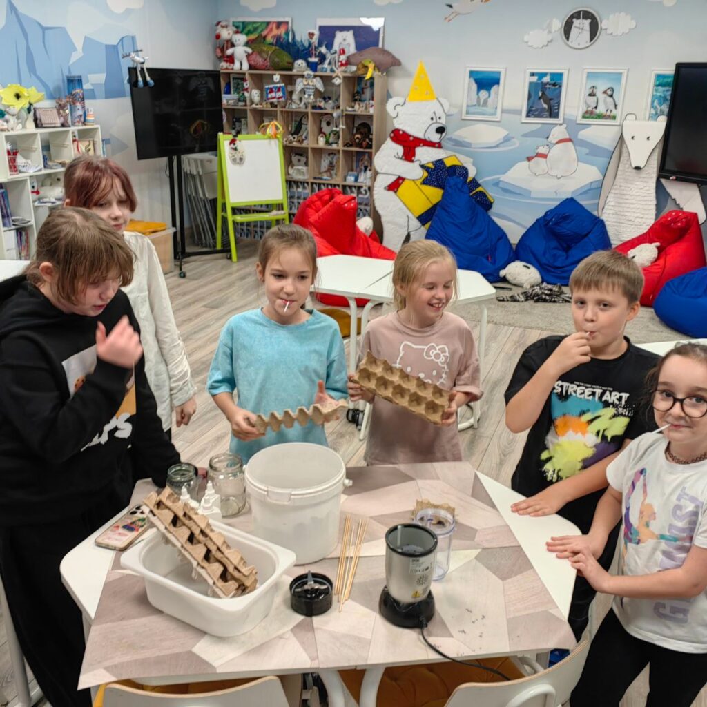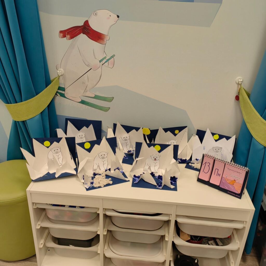 На первом занятии мы погружались в среду: ребята визуализировали ландшафты мест обитания белого медведя: бескрайние ледяные просторы, сверкающий снег и бесконечный полярный день. Мы не только обсудили условия жизни белых медведей, но и приобщились к бережному отношению к окружающей среде 🩵