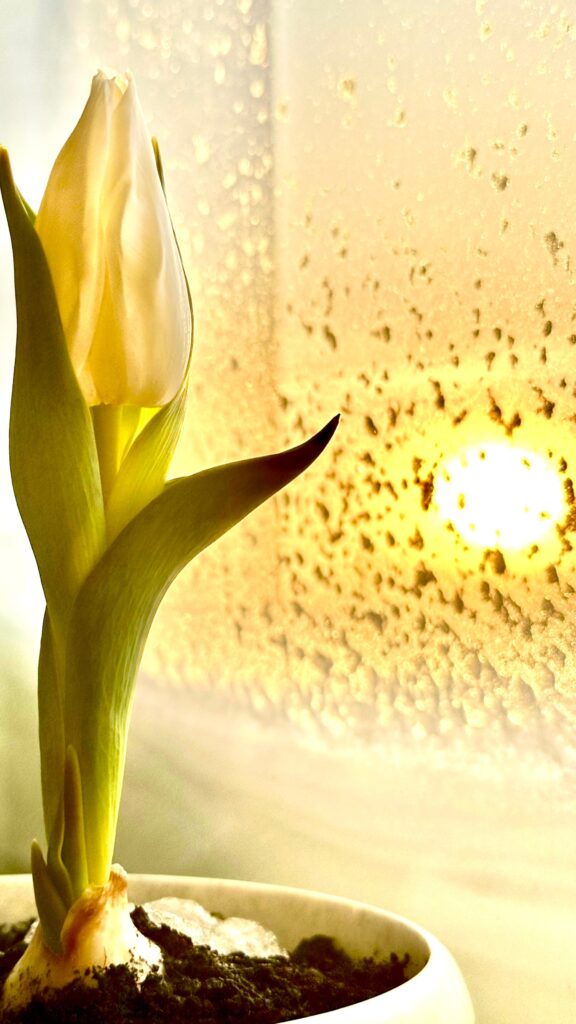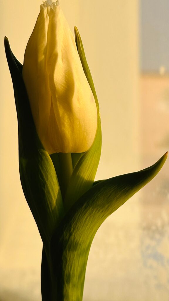Следующими мы ждём жёлтые тюльпаны. Цветонос уже прощупывается между крупными листьями. Думаем, что они будут крупнее и ярче, совсем как наше северное солнце!