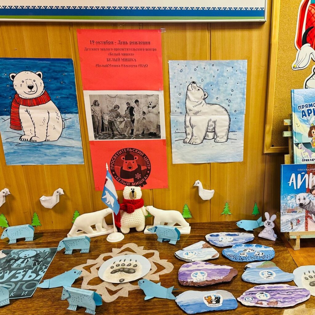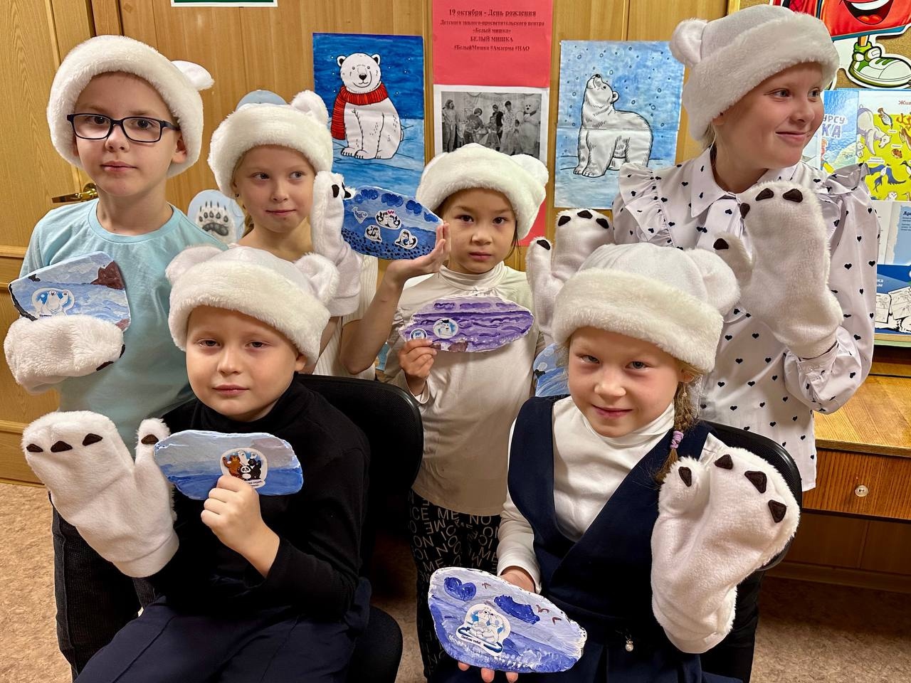 Ребята отмечали день рождения вместе с нами, но на расстоянии: оформили тематическую экспозицию в фойе школы с детскими поделками, сделали лэпбук и написали открыточки для Белого мишки, которые мы теперь с нетерпением ждём!