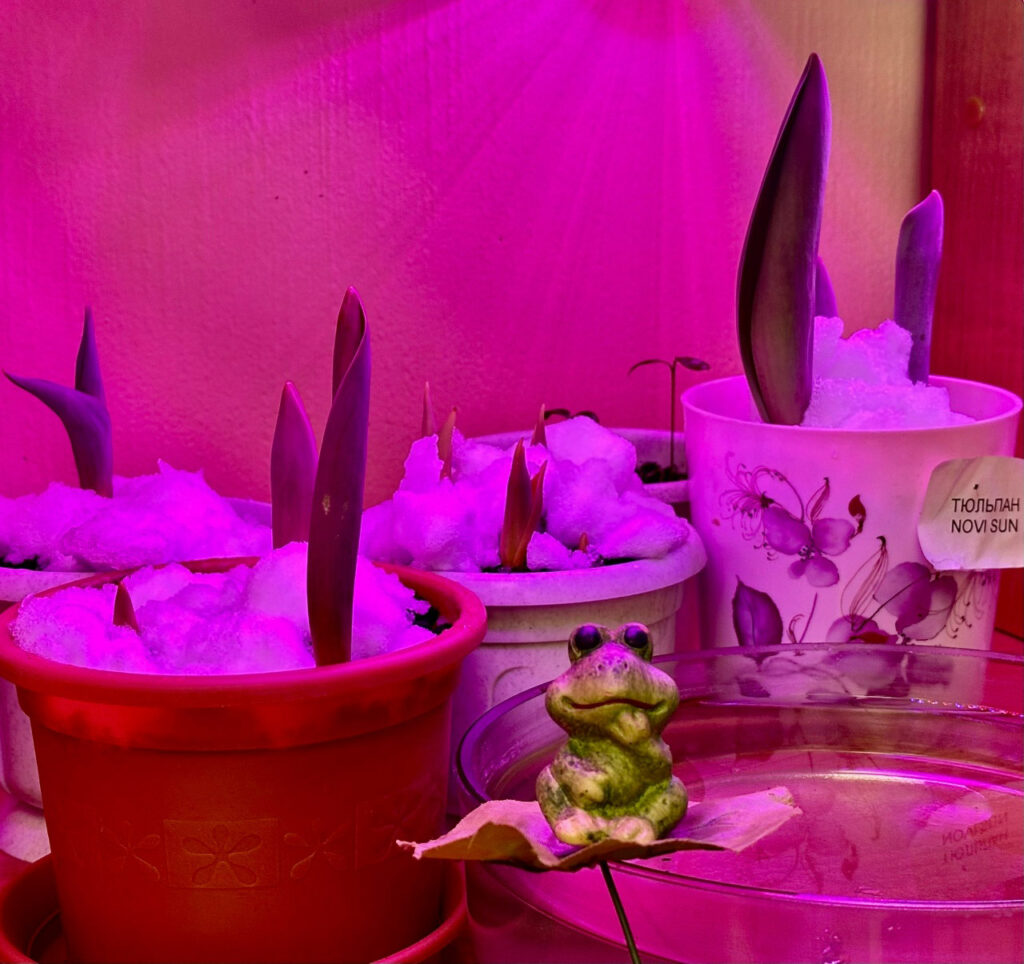 Затем горшки поместили под специальную фитолампу с фиолетовым и синим свечением. Досвечивпние делаем до 10-и часов в сутки. Считается, что такой свет обеспечивает растениям повышение иммунитета.
