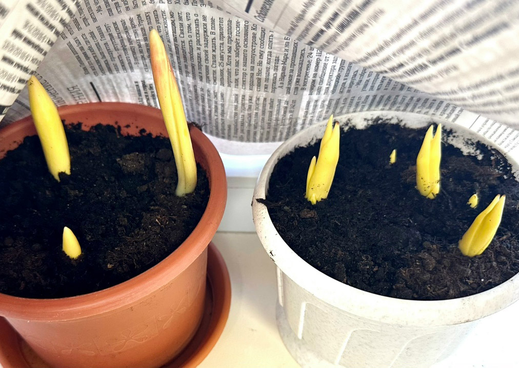 Сначала горшки с желтоватыми ростками мы занесли из прохладного в тёплое помещение класса и оставили на подоконнике, прикрыв листом бумаги, чтобы растения не получили тепловой и световой шок после периода укоренения при низких температурах.