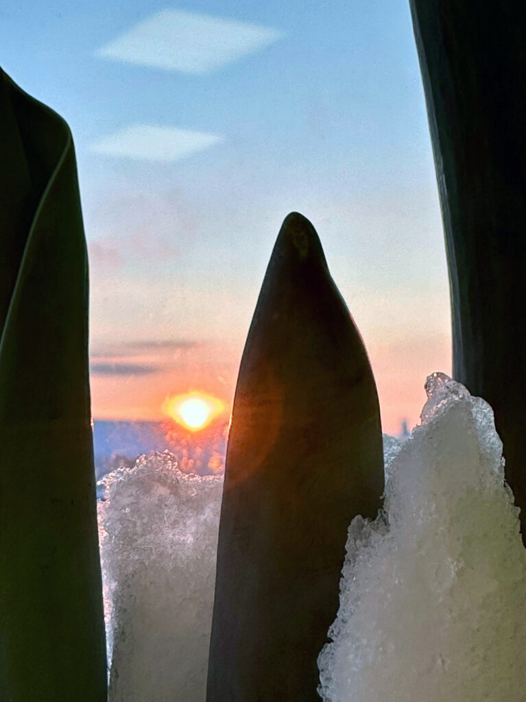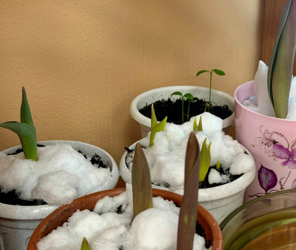 Почву увлажняем, раскладывая вокруг ростков снег. Это совсем как в тёплый весенний денёк: тепло, яркий свет и талая вода! Надеемся, что дождёмся и настоящих, живых цветочков!